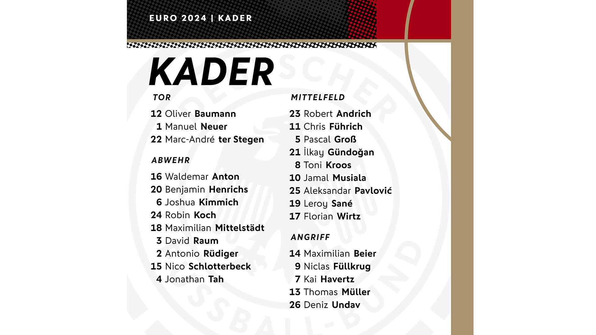 Verzichten wird Nagelsmann im finalen Kader, der laut UEFA insgesamt 26 Spieler umfassen darf, auf Alexander Nübel. Nübel war vom Bundestrainer am 16. Mai für den vorläufigen EM-Kader nominiert worden und hatte in den vergangenen beiden Wochen ebenso wie die U 21-Nationalspieler Rocco Reitz und Brajan Gruda die Vorbereitung auf die Heim-Europameisterschaft mitgemacht. Zunächst in Blankenhain im Weimarer Land, dann im Team Base Camp von DFB-Partner adidas in Herzogenaurach. Gruda hatte bereits am Mittwoch wegen einer muskulären Verletzung in der Wade von der Nationalmannschaft abreisen müssen.